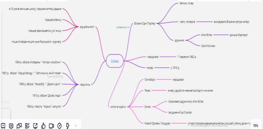 Повідомлення про життєвий і творчий шлях О.Генрі (за індивідуальним домашнім завданням) (На дошці розміщено фото письменника, ілюстрації до книг, інтелект карта на біографію письменника.