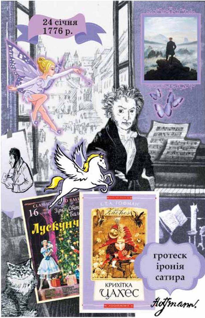 16. Розгляньте й проаналізуйте підсумковий плакат до теми1, поданий на наступній сторінці. Поміркуйте, які аспекти життя і творчості Гофмана він увиразнює. Розшифруйте символіку таких зображень: панорама у відкритому вікні; картина, розміщена праворуч від нього; обкладинка книжки; афіша вистави. Кого із зображених персонажів ви віднесли б до філістерів, а кого — до ентузіастів? Які деталі плаката нагадують про універсальність таланту Гофмана? Як стосуються творчості письменника крилатий кінь і метелики2? Чи відображено в плакаті основні особливості художнього світу автора “Крихітки Цахеса...”?