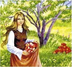 Незабаром дійшла вона до яблуні й почувши, як та кричить: «Ох, обтруси мене, обтруси, мої яблука давно вже достигли!» - відповіла: «От не мала роботи! Ще якесь яблуко на голову мені впаде!» - і пішла далі.