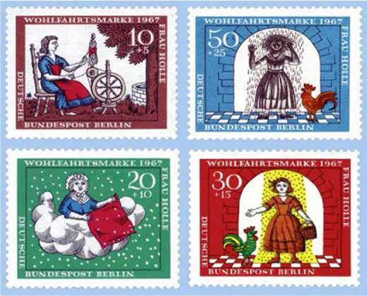 9. Свідченням великої популярності «Пані Метелиці» у Східній Німеччині стала серія марок з ілюстраціями до цієї казки, випущена в 1960-х роках. Розгляньте репродукції1 і вкажіть, які епізоди на них відтворено. Чому, на вашу думку, саме ці епізоди було обрано для зображення на марках?